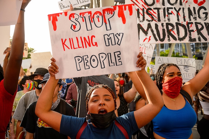 (Trent Nelson | The Salt Lake Tribune) People raising their hands in front of the Public Safety Building during a protest against police brutality in Salt Lake City on Monday, June 1, 2020.