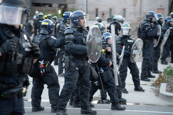 (Trent Nelson | The Salt Lake Tribune) Police take position around the Public Safety Building in Salt Lake City as protests against police brutality continue on Monday, June 1, 2020.