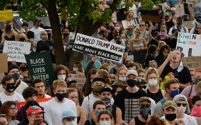 (Francisco Kjolseth | The Salt Lake Tribune) Demonstrators protesting against police brutality gather at the Park building at the University of Utah on Wednesday, June 3, 2020, in Salt Lake City, as the initially set 8 p.m. weeklong curfew was removed.