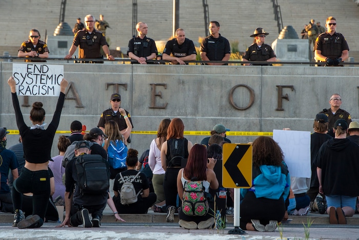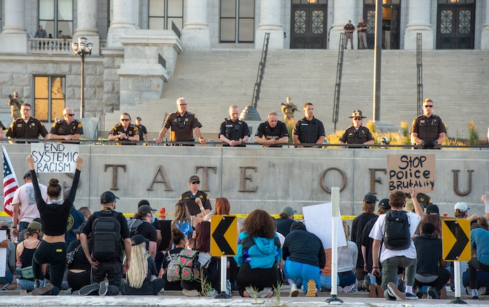 (Francisco Kjolseth | The Salt Lake Tribune) Salt Lake City officers take a knee as toe show his support of demonstrators protesting against police brutality on Wednesday, June 3, 2020, in downtown Salt Lake City, at the Salt Lake City Public Safety Building as the initially set 8 p.m. weeklong curfew was removed.
