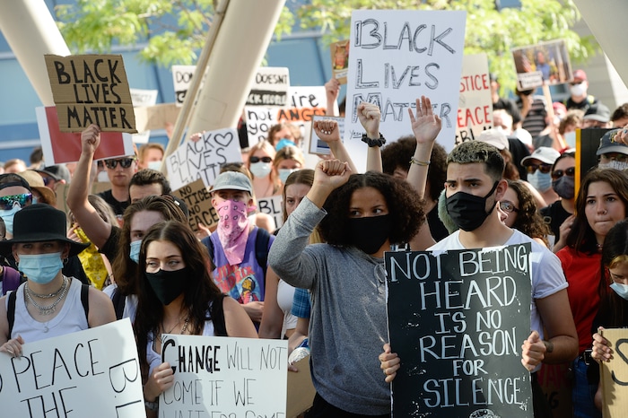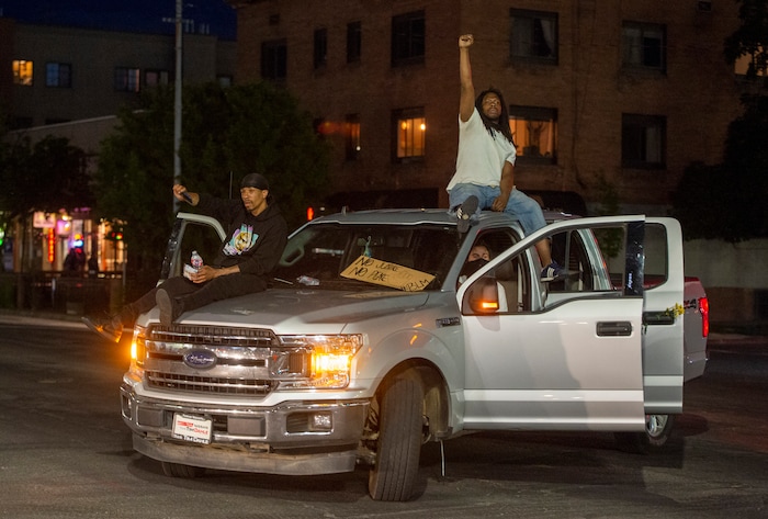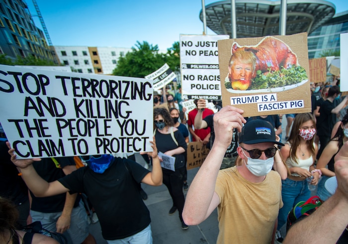 (Francisco Kjolseth | The Salt Lake Tribune) Demonstrators protest against police brutality on Wednesday, June 3, 2020, in downtown Salt Lake City, as the initially set 8 p.m. weeklong curfew was removed.