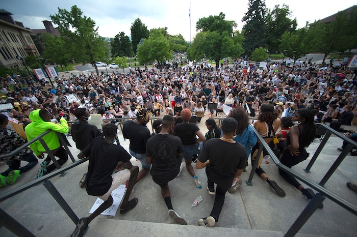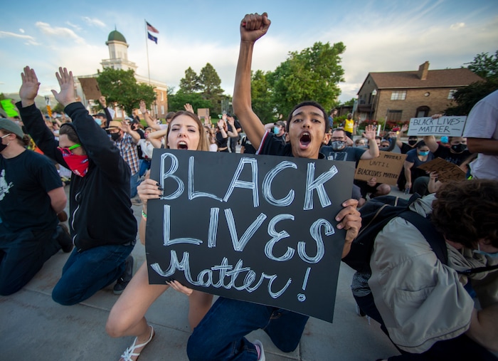 (Rick Egan | The Salt Lake Tribune) Protesters take a knee in front of the Park Building at the University of Utah, during a demonstration, Wednesday, June 3, 2020.