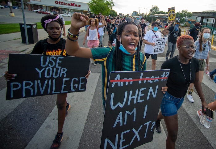 ((Rick Egan | The Salt Lake Tribune) Diane Bahati leads the group in a chant as they march to the University of Utah during a George Floyd demonstration on Wednesday, June 3, 2020.