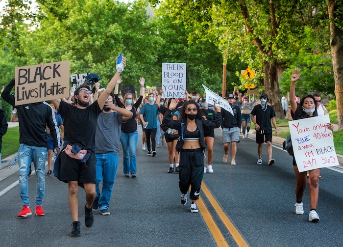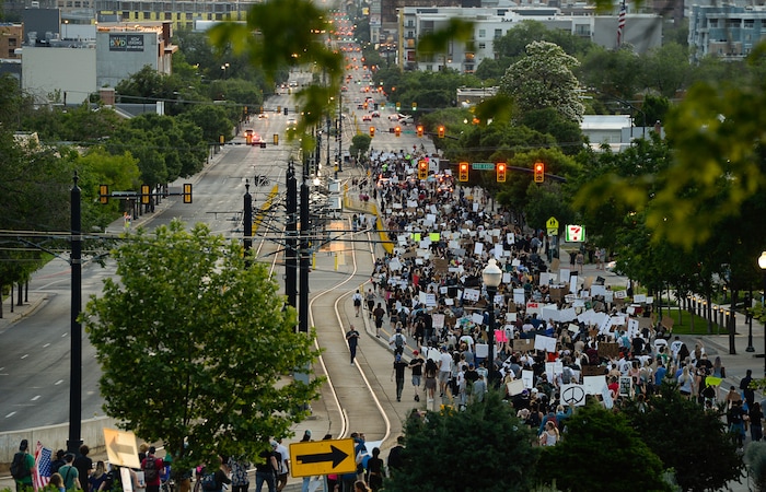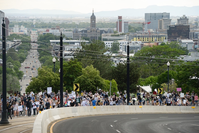 (Rick Egan | The Salt Lake Tribune) Protesters march down from Capitol Hill during a George Floyd demonstration, June 3, 2020.