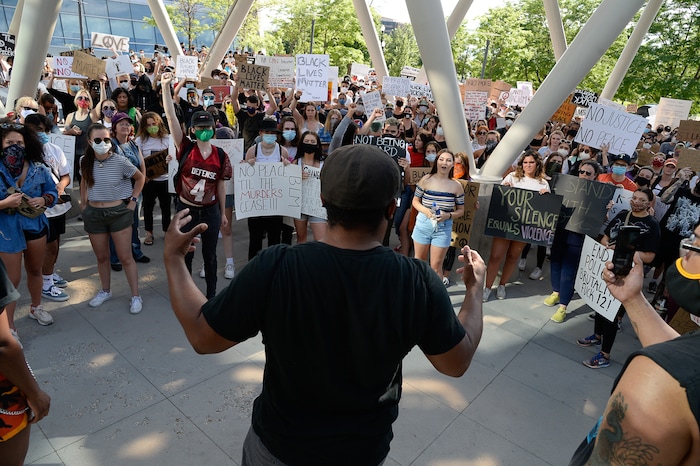 ((Rick Egan | The Salt Lake Tribune) Diane Bahati, leads the crowd as they chant in front of the Park Building at the University of Utah, during a demonstration on Wednesday, June 3, 2020.