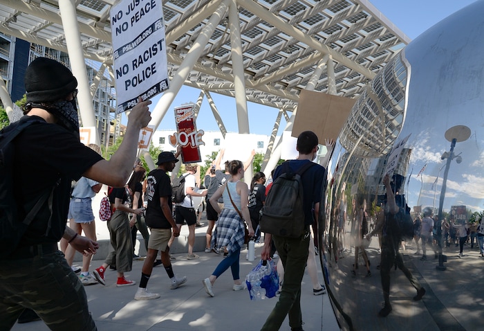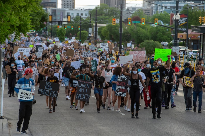 (Rick Egan | The Salt Lake Tribune) Protesters leave the Public Safety Building in Salt Lake City as they start out for the University of Utah on Wednesday, June 3, 2020.