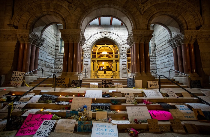 (Rick Egan | The Salt Lake Tribune) Posters, flowers and candles line the steps of the Salt Lake City and County Building late at the evening after all the protesters were gone, Wednesday, June 3, 2020.