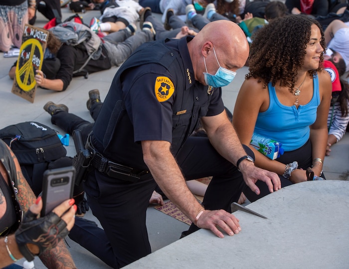 ((Rick Egan | The Salt Lake Tribune) Salt Lake City Police Chief Mike Brown kneels in silence for 9 minutes in memory of George Floyd with a group of demonstrators at the Public Safety Building, Wednesday, June 3, 2020.