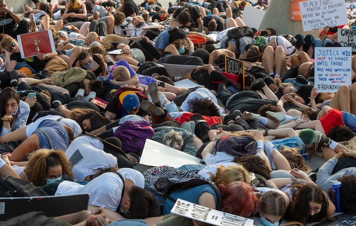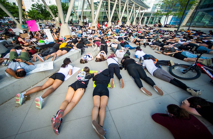 (Rick Egan | The Salt Lake Tribune) Protesters lie down in silence for 9 minutes in memory of George Floyd, during a demonstration at the Public Safety Building, Wednesday, June 3, 2020.