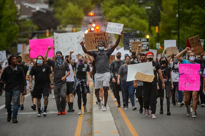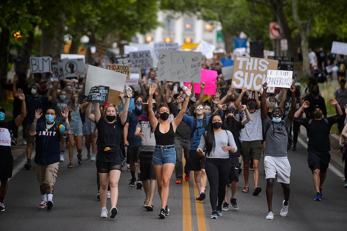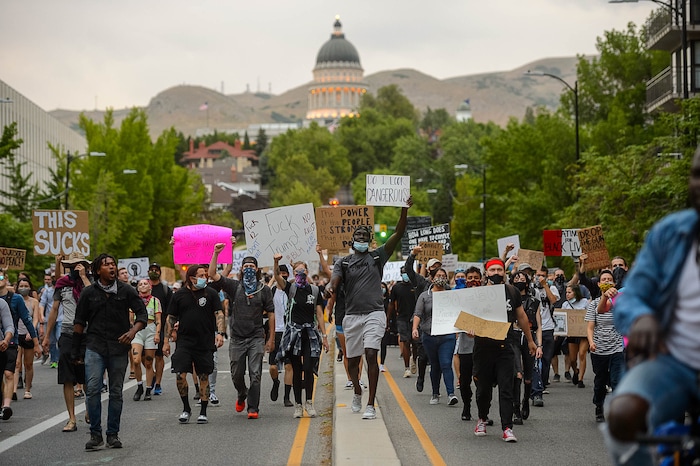 (Trent Nelson | The Salt Lake Tribune) Protesters march against police brutality rally down State Street in Salt Lake City on Friday, June 5, 2020.