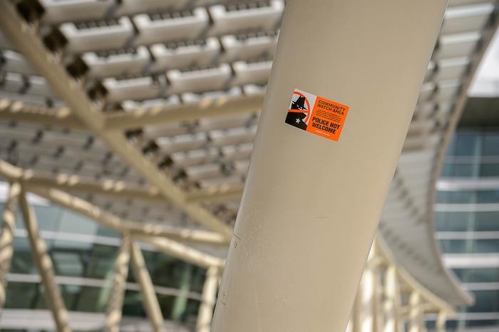 (Trent Nelson | The Salt Lake Tribune) A sticker reads "Police Not Welcome" on the Public Safety Building in Salt Lake City on Friday, June 5, 2020.