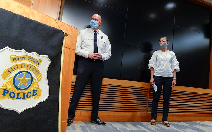 (Leah Hogsten | The Salt Lake Tribune) Salt Lake City Police Department Chief Mike Brown and Mayor Erin Mendenhall during a Salt Lake City police department press conference Friday, June 5, 2020. Salt Lake City police have released the footage that shows them shooting Bernardo Palacios-Carbajal, 22, of Salt Lake City, on May 23, 2020 near 900 South and 300 West.