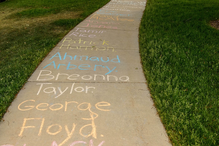 (Trent Nelson | The Salt Lake Tribune) Names written on the sidewalk as protesters rally against police brutality rally at the State Capitol in Salt Lake City on Friday, June 5, 2020.