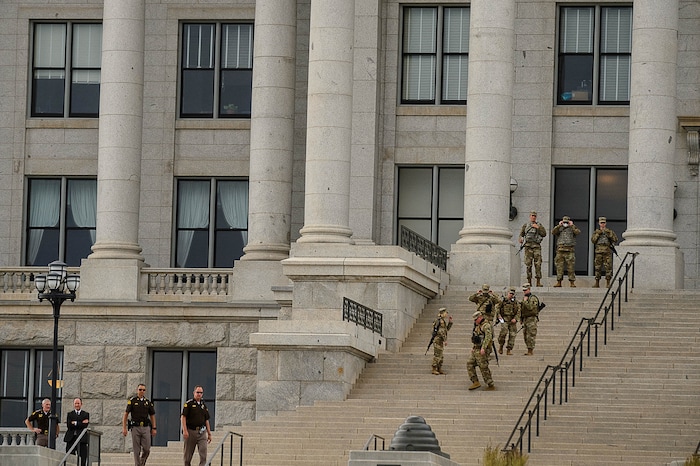 (Trent Nelson | The Salt Lake Tribune) National Guard and police at the State Capitol in Salt Lake City on Friday, June 5, 2020.