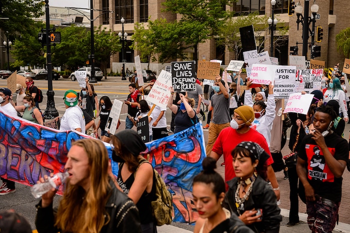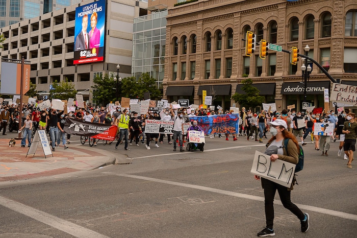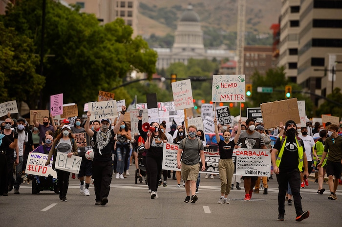 (Trent Nelson | The Salt Lake Tribune) People march against police brutality in Salt Lake City on Saturday, June 13, 2020.
