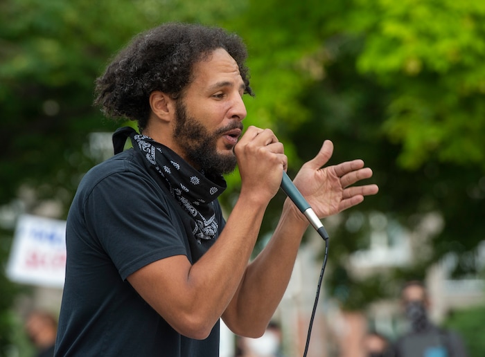 (Rick Egan | The Salt Lake Tribune) John Sullivan speaks during a demonstration against police brutality at Pioneer Park on Saturday, June 13, 2020.