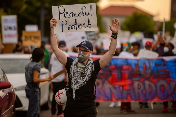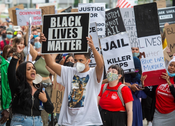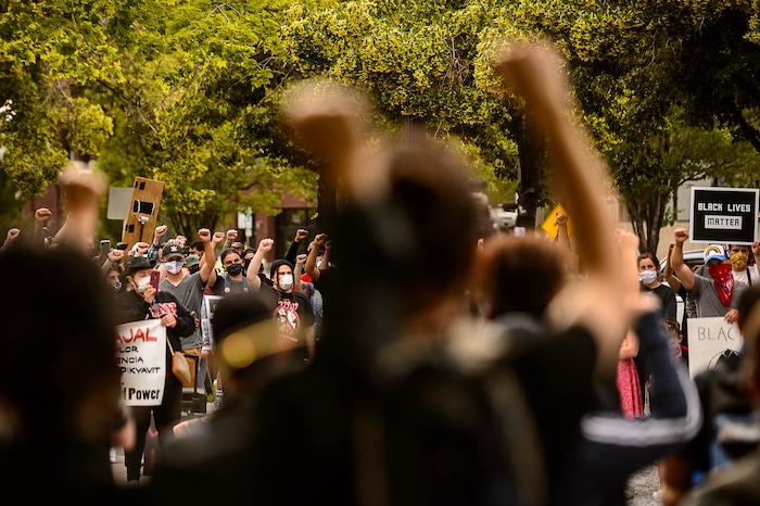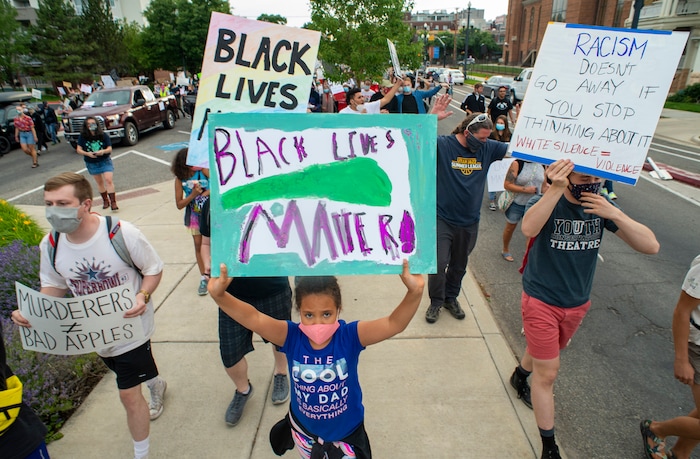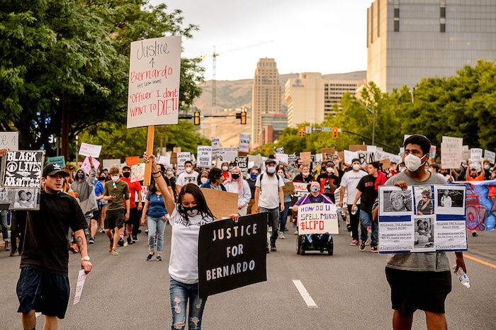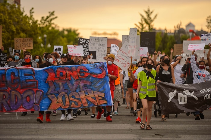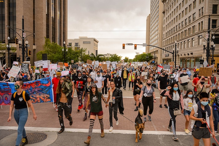 As close to 400 protesters passed throngs of people out Saturday evening in Salt Lake City — those dining on restaurant patios or zooming aimlessly on electric scooters — the marchers chanted “Black lives matter” and “Whose streets? Our streets," raising fists and signs to drive the point home.