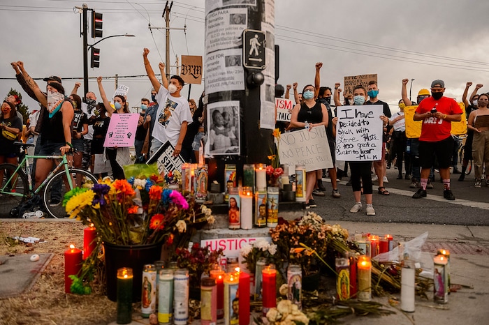 (Trent Nelson | The Salt Lake Tribune) People gather at the site where Bernardo Palacio-Carbajal was killed by pollice, in Salt Lake City on Saturday, June 13, 2020.