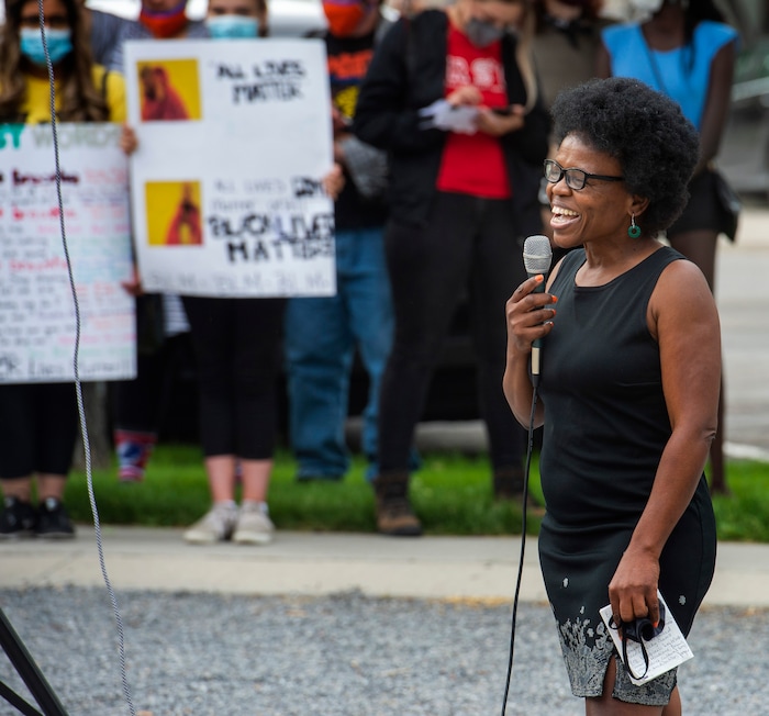 (Rick Egan | The Salt Lake Tribune) Victoria Sethunya speaks during a demonstration against police brutality at Pioneer Park on Saturday, June 13, 2020.
