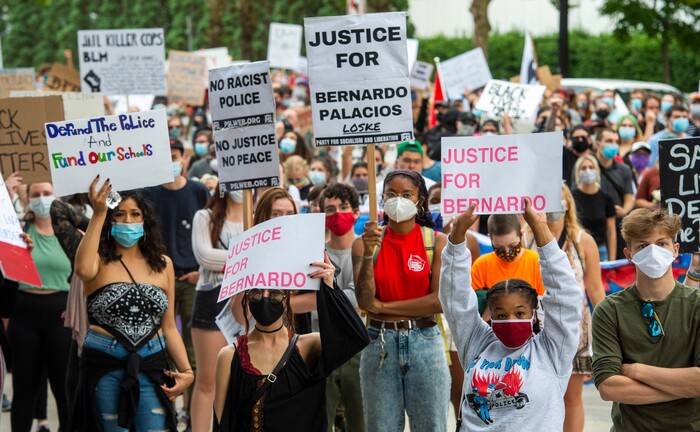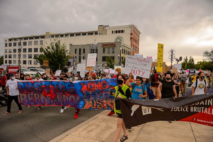 On their way to a memorial for Bernardo Palacios-Carbajal near 300 W. 900 South from Pioneer Park in downtown, the protesters stopped in front of the Salt Lake County District Attorney’s Office, a building decorated with a biophotonic glass proclaiming tenets District Attorney Sim Gill says his office holds dear: Due process, justice, equality, trust, and public service as duty.