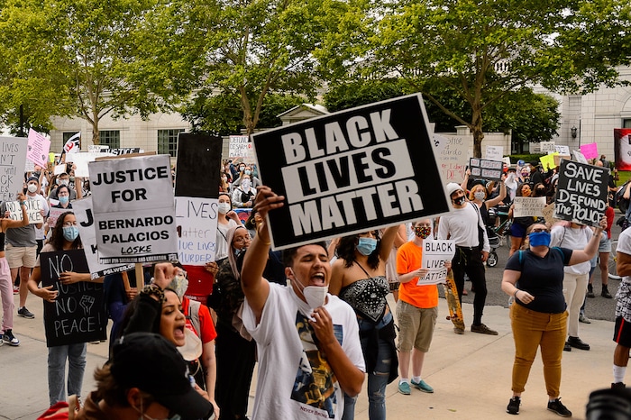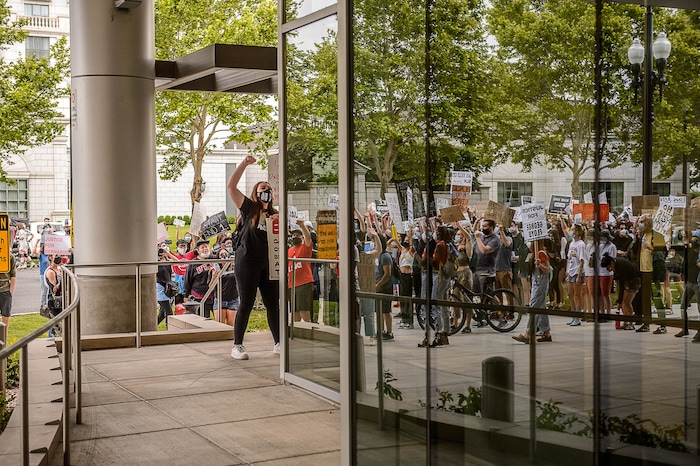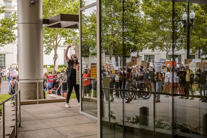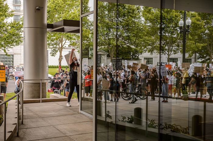 (Trent Nelson | The Salt Lake Tribune) People gather at the Salt Lake County District Attorney's office to protest against police brutality in Salt Lake City on Saturday, June 13, 2020.