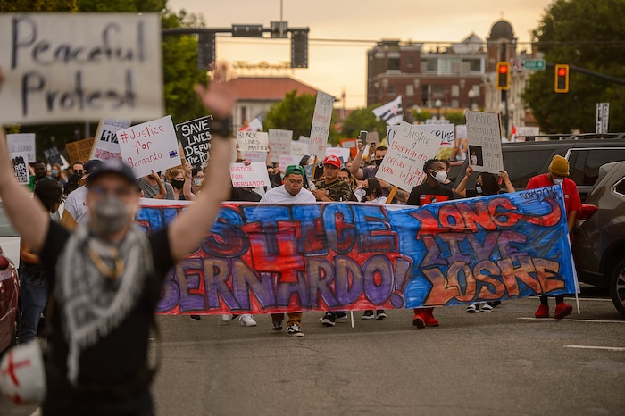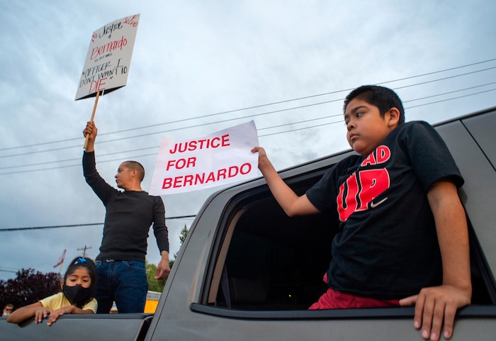 (Rick Egan | The Salt Lake Tribune) Josh and Aydn Palacios hold signs as the marchers stop at the memorial for Bernardo Palacios-Carbajal during a demonstration on 900 South 300 West in Salt Lake City on Saturday, June 13, 2020.