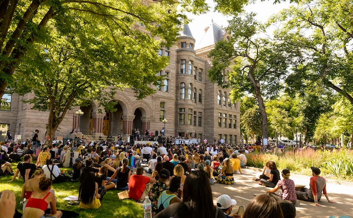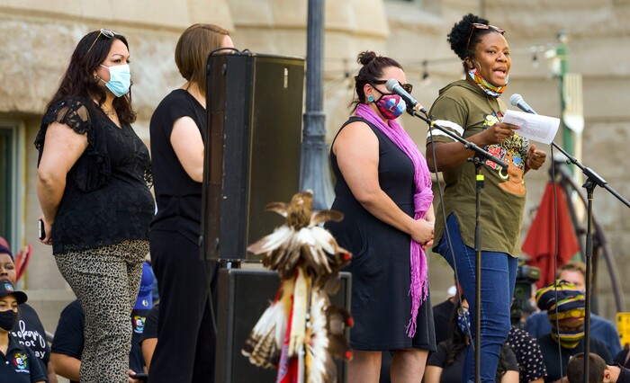 (Leah Hogsten | The Salt Lake Tribune) l-r Sen. Luz Escamilla, D-Salt Lake City, Rep. Angela Romero, D-Salt Lake City and Rep. Sandra Hollins, D-Salt Lake City spoke to the crowd on Sunday. Over 1,000 Pride for Black Lives Matter supporters rallied at Liberty Park, Sunday, June 14, 2020 for over three hours before marching throughout Salt Lake City to join the Las Vidas Negras Importan Rally at Washington Square.