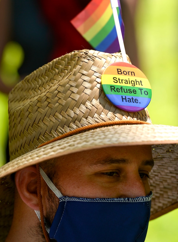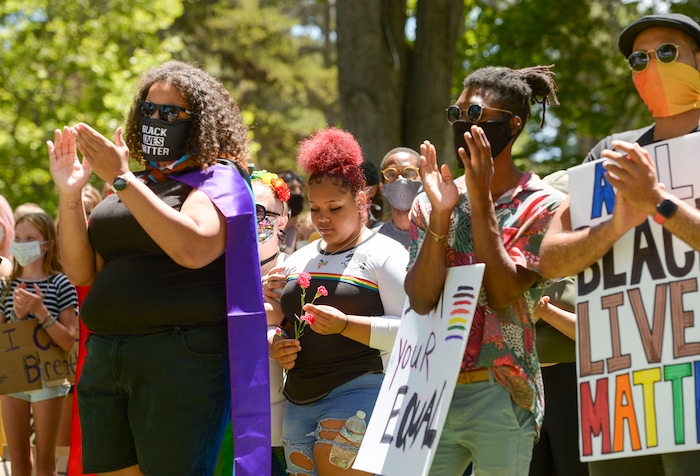 Sunday’s protest was a combined event for supporters of the LGBTQ community and Black Lives Matter. Fourteen people — all black, some LGBTQ — spoke to the crowd at Liberty Park.