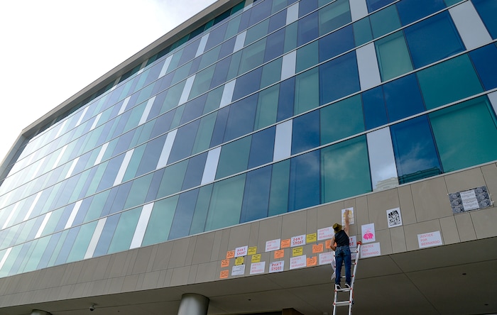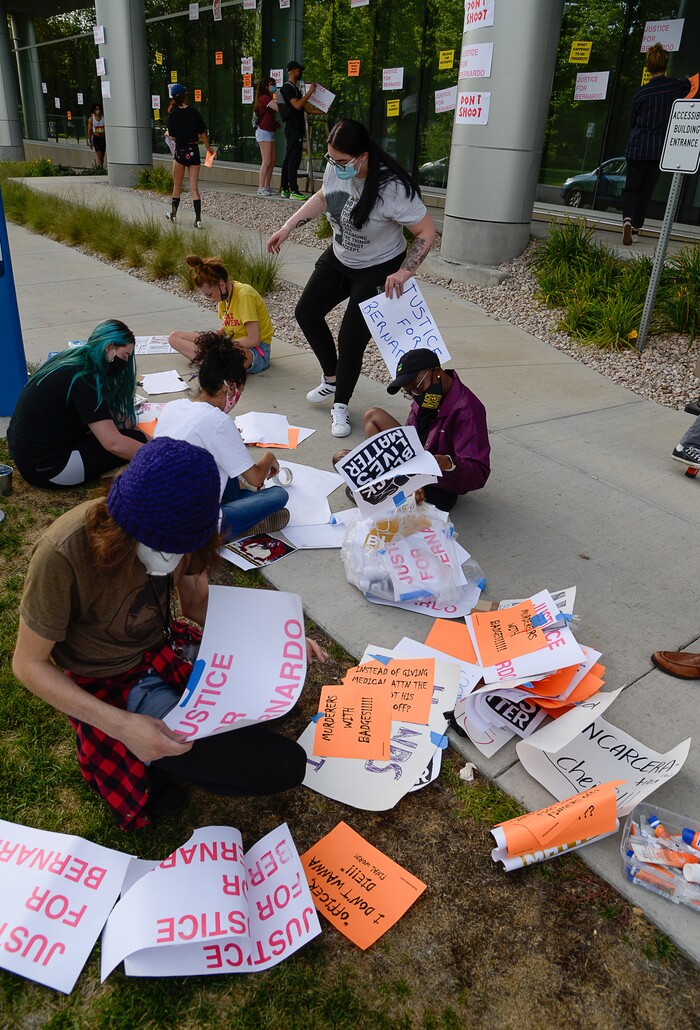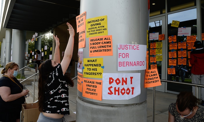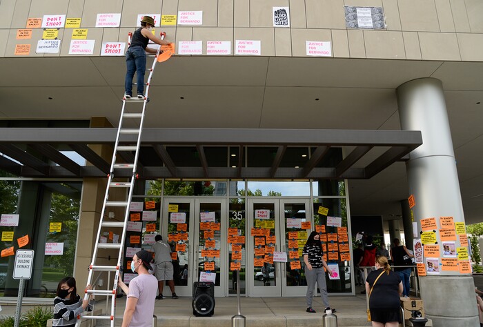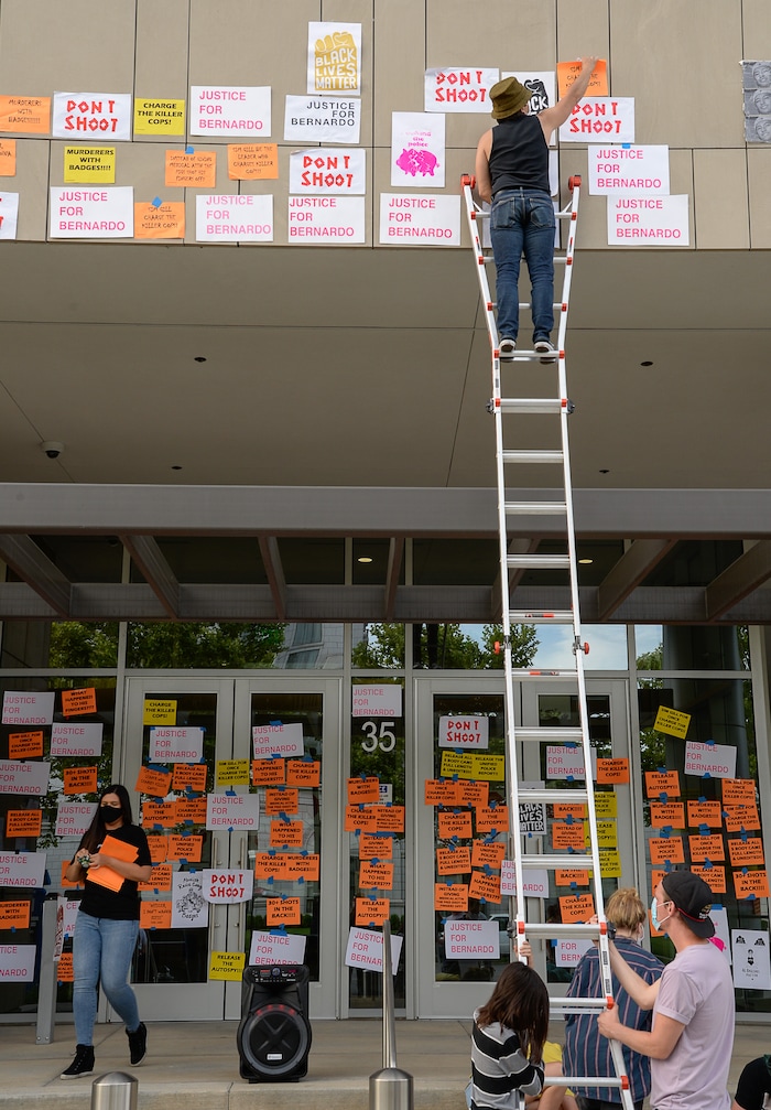 Using a ladder to reach higher spots, the group of demonstrators covered the glass walls of the DA’s office with signs that read, among other things, “Justice for Bernardo” and “Don’t shoot.”