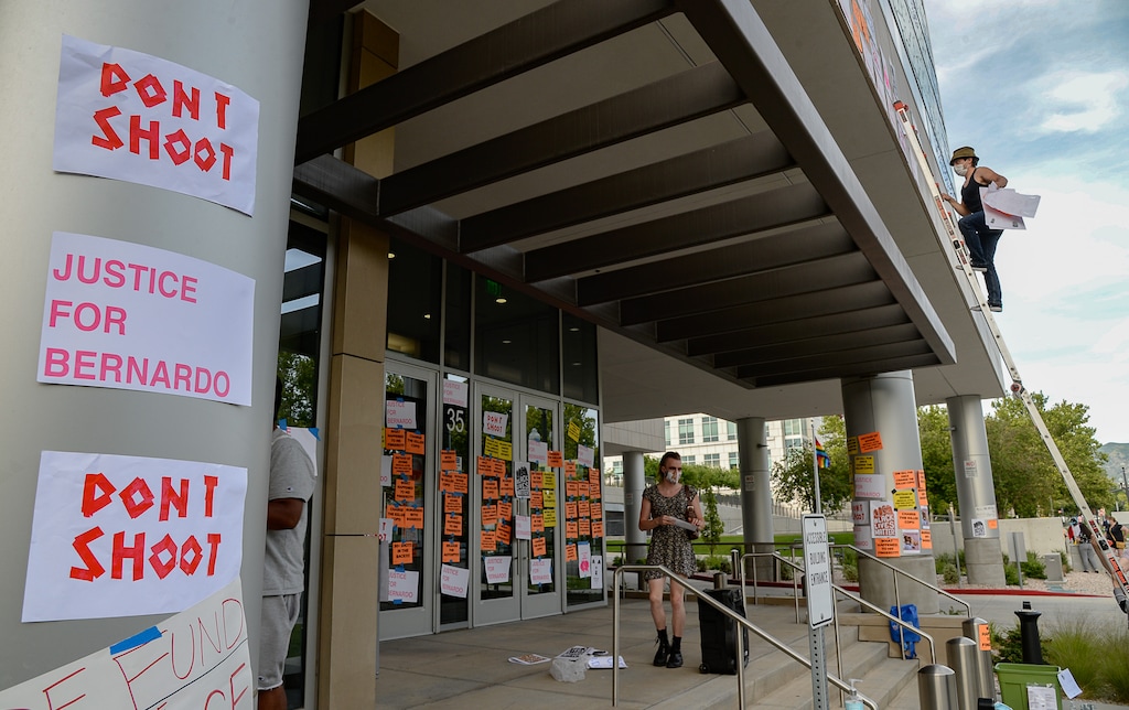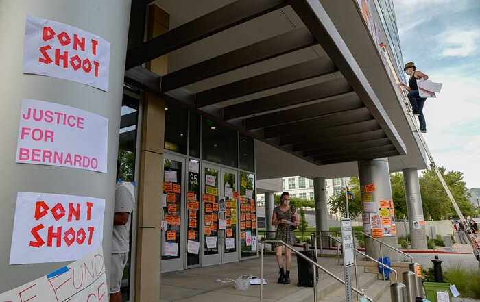 Protesters cover Salt Lake County district attorney’s office with signs demanding ‘Justice for Bernardo’