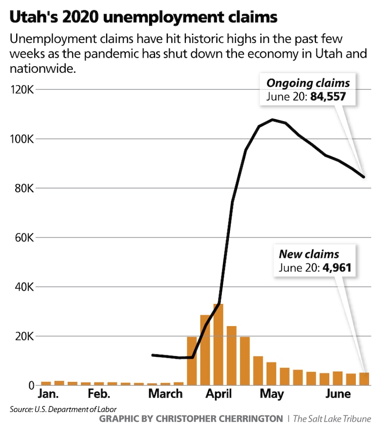Yet Utah’s new unemployment claims have not dipped below 4,803 — the number filed the week ending June 13 — since they first began shooting upward due to COVID-19 in mid-March. And a July 31 deadline is looming for when federal relief, in the form of significantly boosted jobless benefits, is expected to expire.