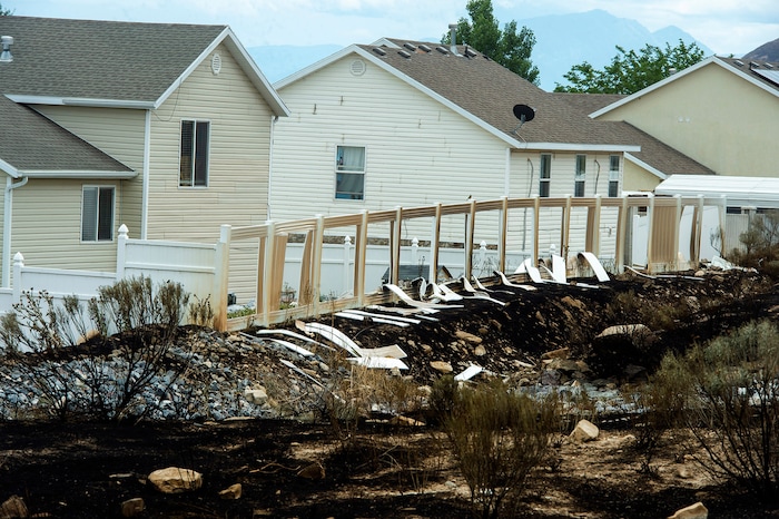 (Rick Egan | The Salt Lake Tribune) The Knolls Fire melted fences and did some property damage but spared the homes on Sunrise Drive in Sunday's fire in Saratoga Springs, Monday, June 29, 2020.