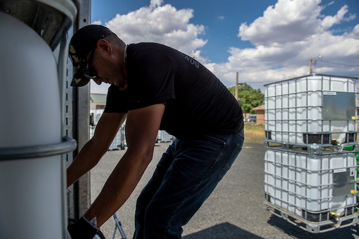 (Leah Hogsten | The Salt Lake Tribune) Donovan Smallcanyon, a solar and water technician on the Navajo Water Project for DigDeep, manuvers a 250-gallon water tank in Dilkon, Ariz., June 23, 2020. Smallcanyon keeps solar-powered panel systems and propane hot water heaters working and fills cisterns at least once a month for residents in Navajo Mountain and Piute Mesa in San Juan County.