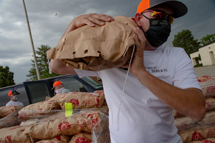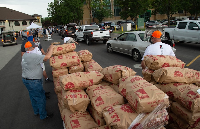 (Francisco Kjolseth | The Salt Lake Tribune) Nelson Abbott loads 50-pound bags of potatoes in people’s trunks as the third “Miracle Project” for the nonprofit foundation which raises money to purchase food produced by Utah farmers and then gives to residents in need, takes place at the Utah State Fairpark in Salt Lake City on Monday, July 27, 2020. The food donation from the Utah Farm Bureau’s “Farmers Feeding Utah” program provided food for 600 individuals and families who have recently become unemployed due to the coronavirus.