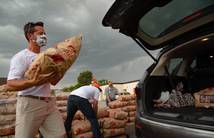 (Francisco Kjolseth | The Salt Lake Tribune) Jared Smith loads 50-pound bags of potatoes in people’s trunks as the third “Miracle Project” for the nonprofit foundation which raises money to purchase food produced by Utah farmers and then gives to residents in need, takes place at the Utah State Fairpark in Salt Lake City on Monday, July 27, 2020. The food donation from the Utah Farm Bureau’s “Farmers Feeding Utah” program provided food for 600 individuals and families who have recently become unemployed due to the coronavirus.