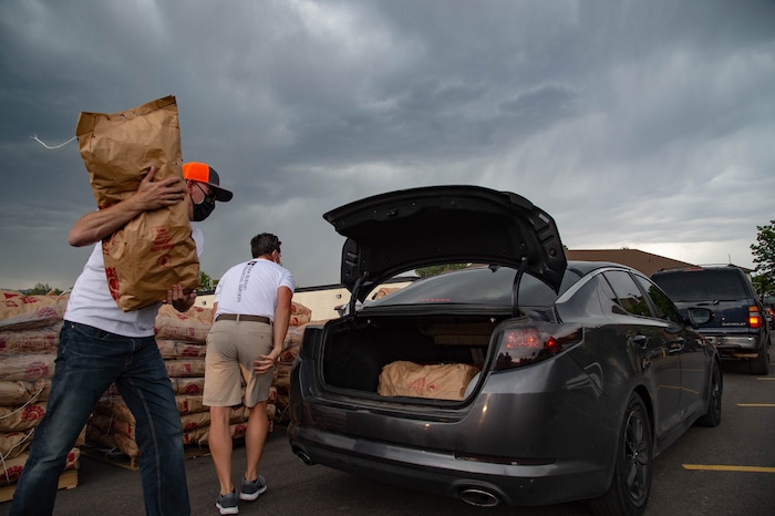 (Francisco Kjolseth | The Salt Lake Tribune) Nelson Abbott , left, and Jared Smith load 50-pound bags of potatoes in people’s trunks as the third “Miracle Project” for the nonprofit foundation which raises money to purchase food produced by Utah farmers and then gives to residents in need, takes place at the Utah State Fairpark in Salt Lake City on Monday, July 27, 2020. The food donation from the Utah Farm Bureau’s “Farmers Feeding Utah” program provided food for 600 individuals and families who have recently become unemployed due to the coronavirus.