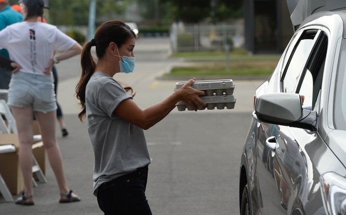 (Francisco Kjolseth | The Salt Lake Tribune) Kelsey Berg offers fresh eggs as the third “Miracle Project” for the nonprofit foundation which raises money to purchase food produced by Utah farmers and then gives to residents in need, takes place at the Utah State Fairpark in Salt Lake City on Monday, July 27, 2020. The food donation from the Utah Farm Bureau’s “Farmers Feeding Utah” program provided food for 600 individuals and families who have recently become unemployed due to the coronavirus.