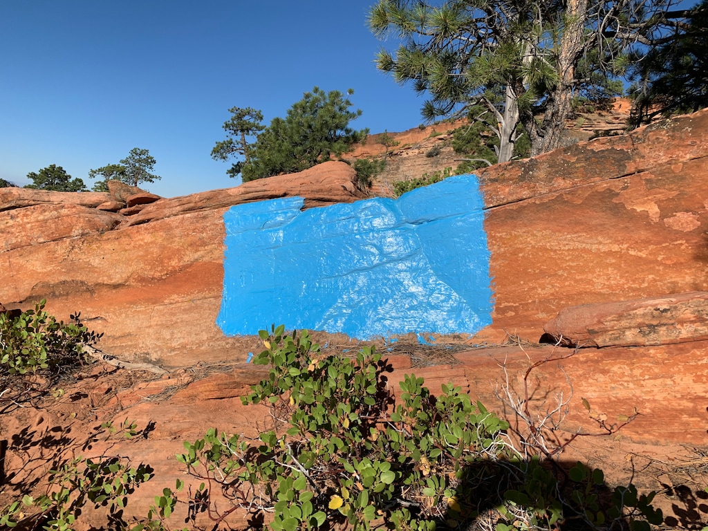 (Photo courtesy of Zion National Park) Park rangers are investigating after vandals painted sandstone in the park with blue paint.