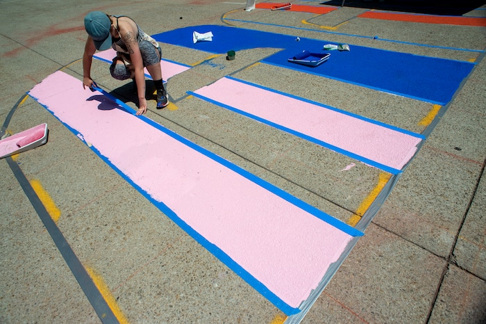 (Rick Egan | The Salt Lake Tribune) Veronica Zac paints the letter ÒTÓ in the Black Lives Matter mural, on the south side of City Hall on Tuesday, Aug. 4, 2020.
