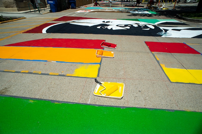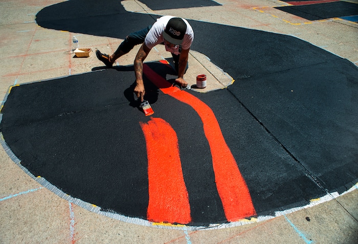 (Rick Egan | The Salt Lake Tribune) Artist Chandara Chuon, works on the letter ÒSÓ in the Black Lives Matter mural, on the south side of Salt Lake City Hall on Tuesday, Aug. 4, 2020.