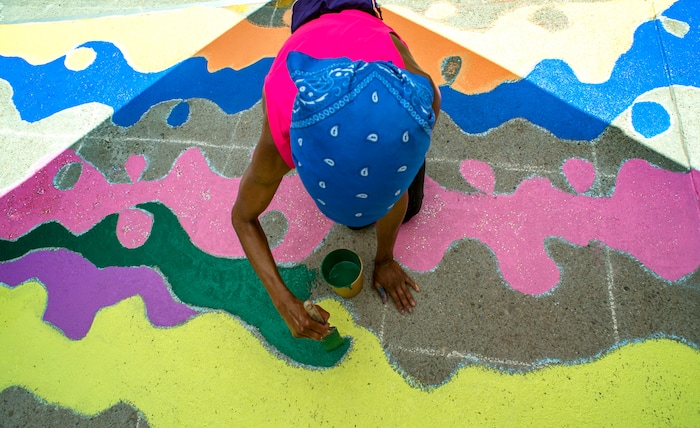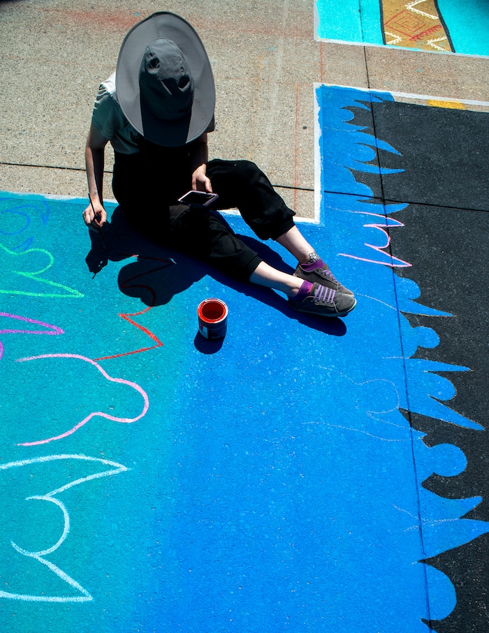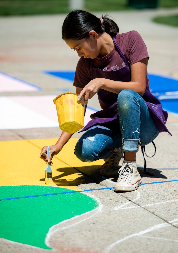 (Rick Egan | The Salt Lake Tribune) Sixteen-year-old artist, Abigail Rodriguez, works on on of the letters in the Black Lives Matter mural, on the south side of Salt Lake City Hall on Tuesday, Aug. 4, 2020.