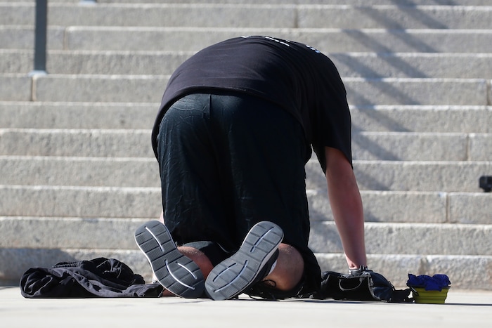 Shane Brooks, a Marine Corps veteran, kneels for nine hours outside the Utah Capitol to call attention to racial injustice, police brutality and mental health, Thursday, Aug. 6, 2020, in Salt Lake City. Brooks said people of color with mental illness are "looked at as if they have already committed a crime" and some end up dead in encounters with police, KTVX-TV reported. Brooks said his marathon silent protest was inspired by Bobby Duckworth, a 26-year-old who was shot and killed in 2019 by police responding to a report of a suicidal person in Wellington, Utah. (AP Photo/Rick Bowmer)