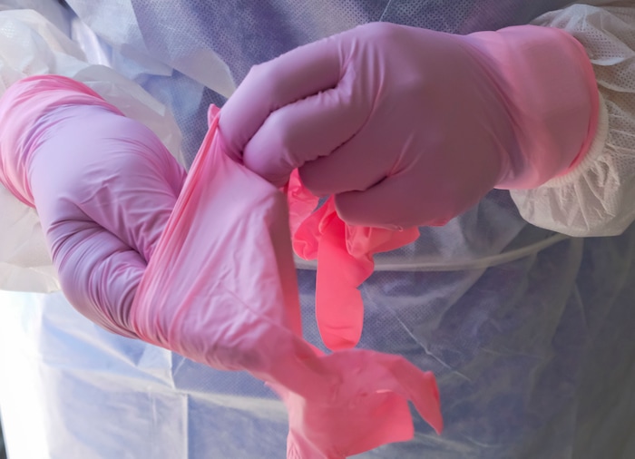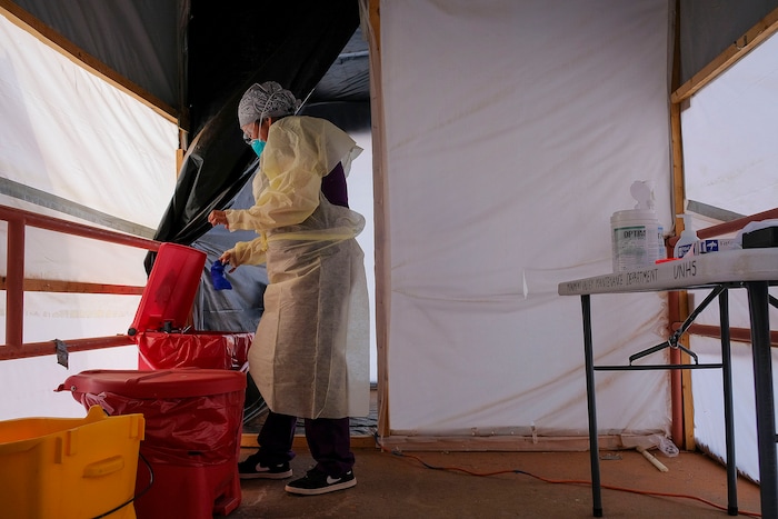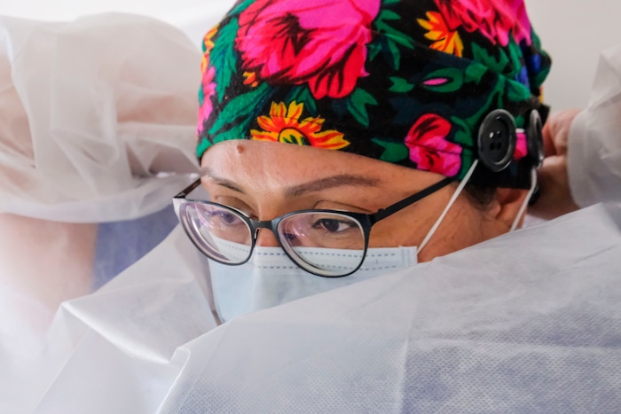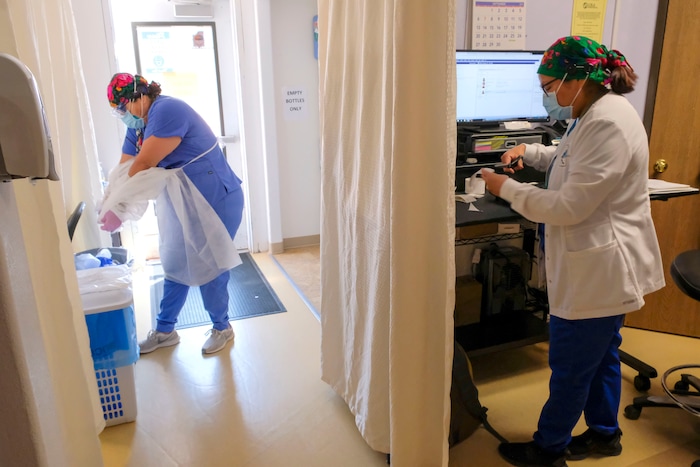 Every time Vijil or Begay leaves the tent and reenters the building, which is necessary between every patient, she disposes of her thin plastic gown, changes gloves and washes her hands.