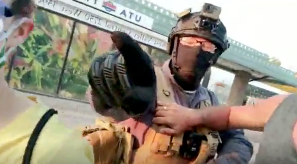 Video of the confrontation posted on social media appears to show the man spraying something at protesters, at least one of whom was taken to a hospital. He can also be seeing holding what looks like a black pistol.