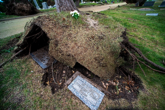 Of the cemetery’s 2,385 trees, 257 went down in the wind. No burial vaults or caskets were disturbed, Riker said, even though large 100-year-old trees ripped out large chunks of the ground as they fell, pulling up asphalt, curbs and gutters.