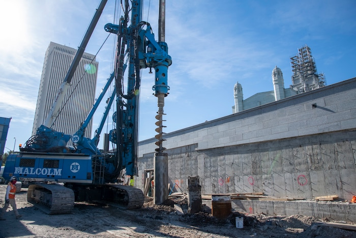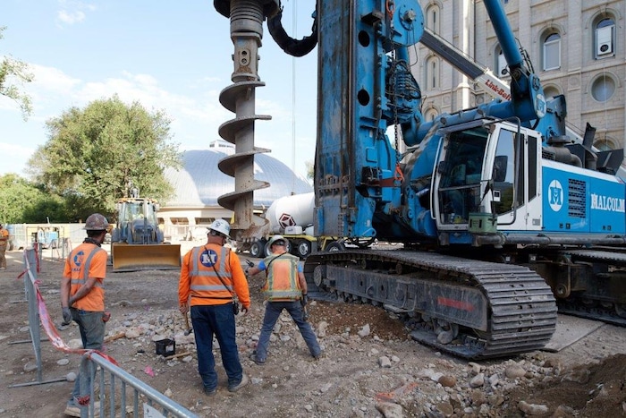 (Photo courtesy The Church of Jesus Christ of Latter-day Saints) In this June 2020 photo, an auger is drilling a hole with the help of segment casings. The 15-foot segment casings help create a hole up to 60 feet deep. A steel piling will be dropped into the hole and filled with concrete. The steel piles are part of a retaining wall that will line the temple property and will also be installed around the temple in preparation for excavating a 40-feet-deep hole as part of the seismic upgrade.