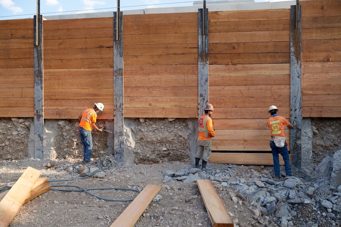 (Photo courtesy The Church of Jesus Christ of Latter-day Saints) In this August 2020 photos, crews install 4-inch-thick wood lagging as part of a construction site retaining wall surrounding the temple grounds. The lagging will eventually go to a depth of 40 feet after excavation is completed. A cable system helps lock the lagging in place to provide additional stability.