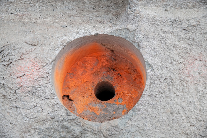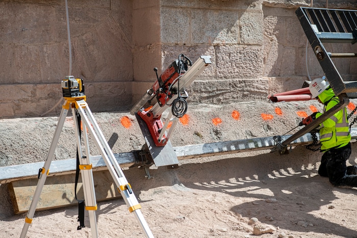(Photo courtesy The Church of Jesus Christ of Latter-day Saints) As part of strengthening the temple foundation in preparation for the seismic upgrade, these holes are drilled. A rod will be inserted, with fasteners that can tighten both sides of the foundation wall, to add stability.