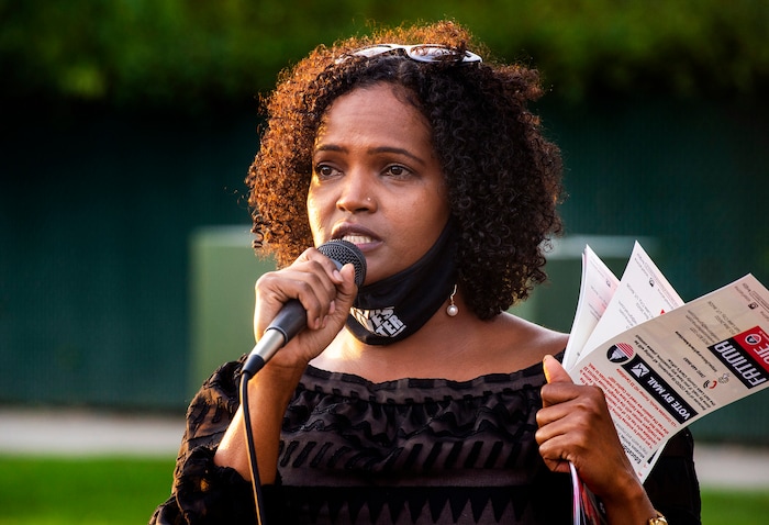 (Rick Egan | The Salt Lake Tribune) Fatima Dirie speaks at the Say Their Names Memorial in Salt Lake City, on Saturday, Sept. 26, 2020.