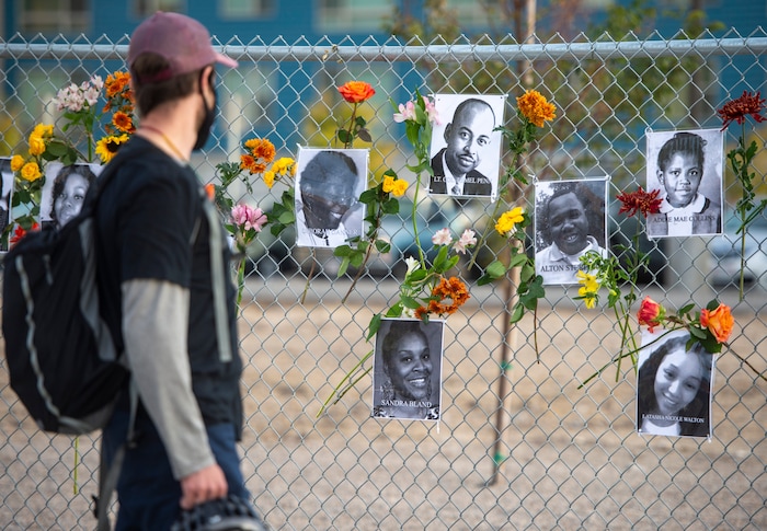 (Rick Egan | The Salt Lake Tribune) Flowers accompany photos of Black lives that have been lost at the Say Their Names Memorial in Salt Lake City, on Saturday, Sept. 26, 2020.